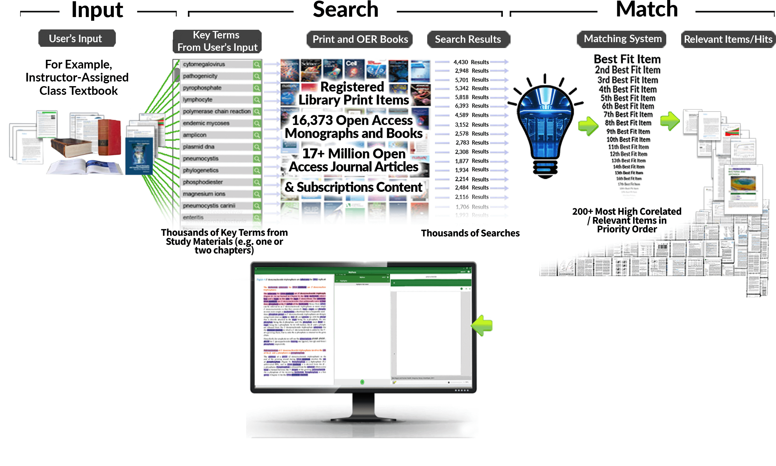 sorts those matches by relevance to the source materials. The diagram below illustrates the process.